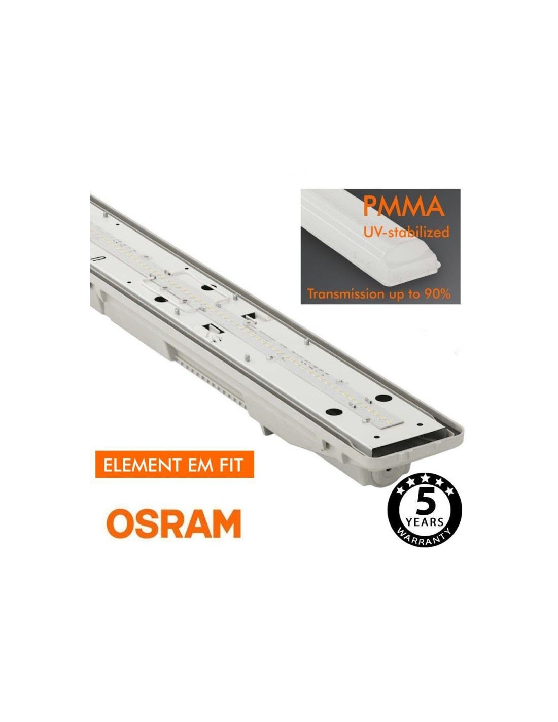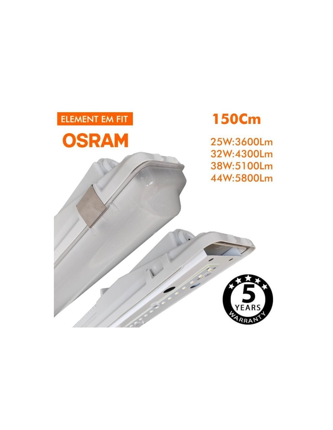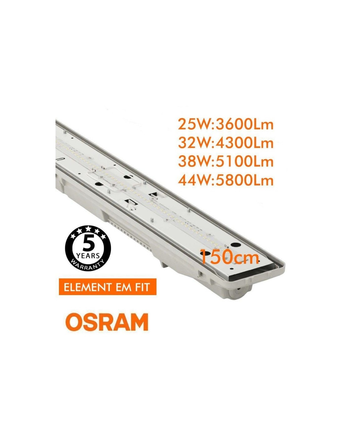 Die integrierte LED Feuchtraumleuchte bietet eine zuverlässige und effiziente Beleuchtungslösung mit wählbarer Leistung von 25W bis 44W und einem hochwertigen OSRAM Treiber. Mit einer Länge von 150cm eignet sie sich ideal für vielfältige Einsatzbereiche – innen und außen.