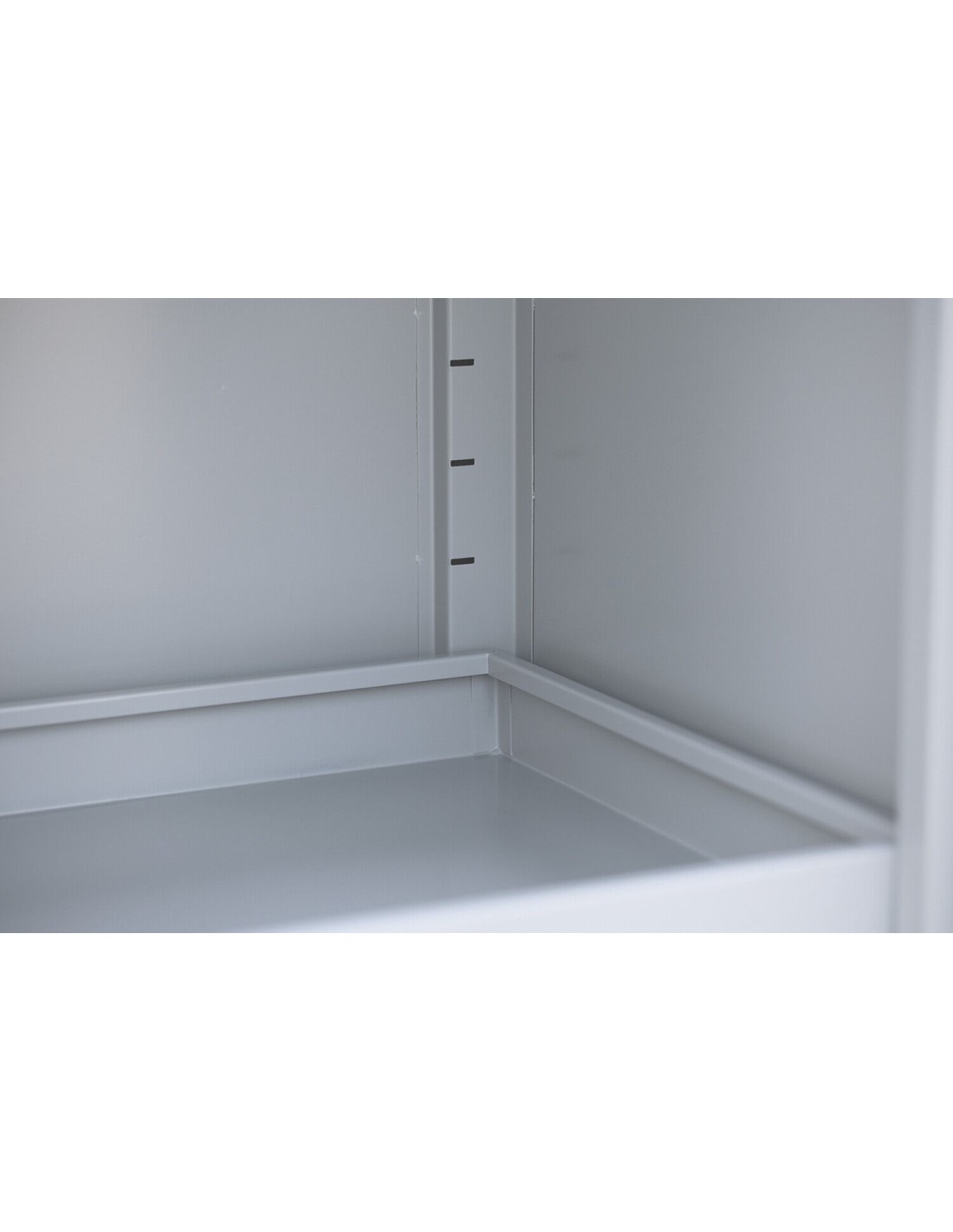 Nachfolgend erfahren Sie weitere wichtige Kriterien zur Materialart: Stahl, aus dem der Korpus besteht, hat eine lange Lebensdauer und besondere Robustheit. So haben Sie lange Freude an diesem Produkt. Das Möbelteil hat eine Wandstärke von 0,7 mm. Die Oberfläche dieses Möbelteils hat eine leicht zu reinigende und widerstandsfähige Pulverbeschichtung. Damit Ihre Materialien sicher verwahrt sind, ist das Produkt abschliessbar. Dies ermöglicht hier das zuverlässige Zylinderschloss mit 2-Punkt-Schliessung.