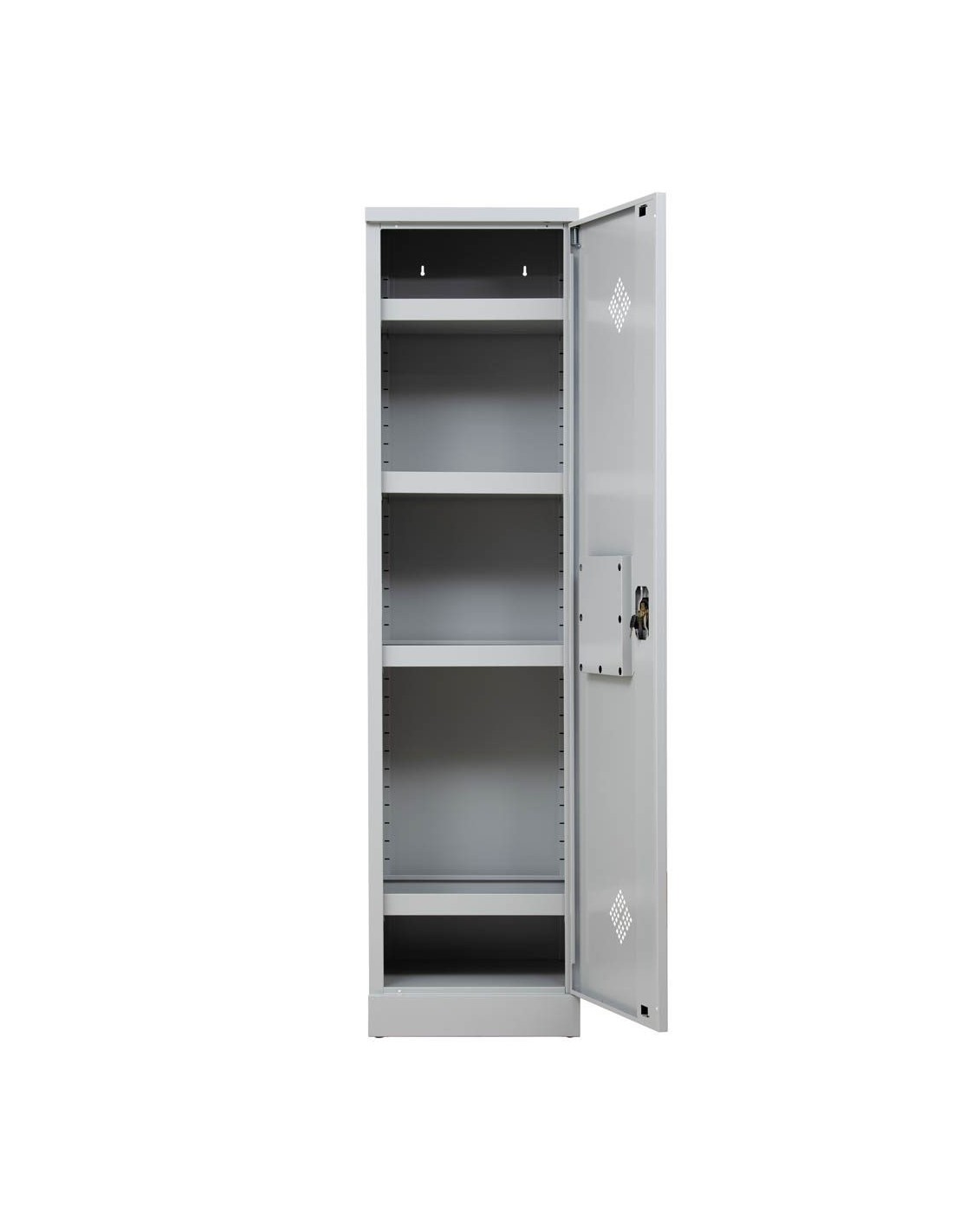 Zur vorschriftsgemässen und sicheren Lagerung von giftigen oder wassergefährdenden Stoffen wird der Wolfstahl Umweltschrank lichtgrau 50,0 x 42,0 x 195,0 cm, aufgebaut eingesetzt. Ob Pflanzenschutzmittel, Schmier- oder Klebstoffe – die ordnungsgemässe Unterbringung in diesem praktischen Exemplar minimiert das Risiko von Unfällen und Rohstoffverlusten. Zum Schutz vor unbefugtem Zugriff dienen die verschliessbaren Türen.