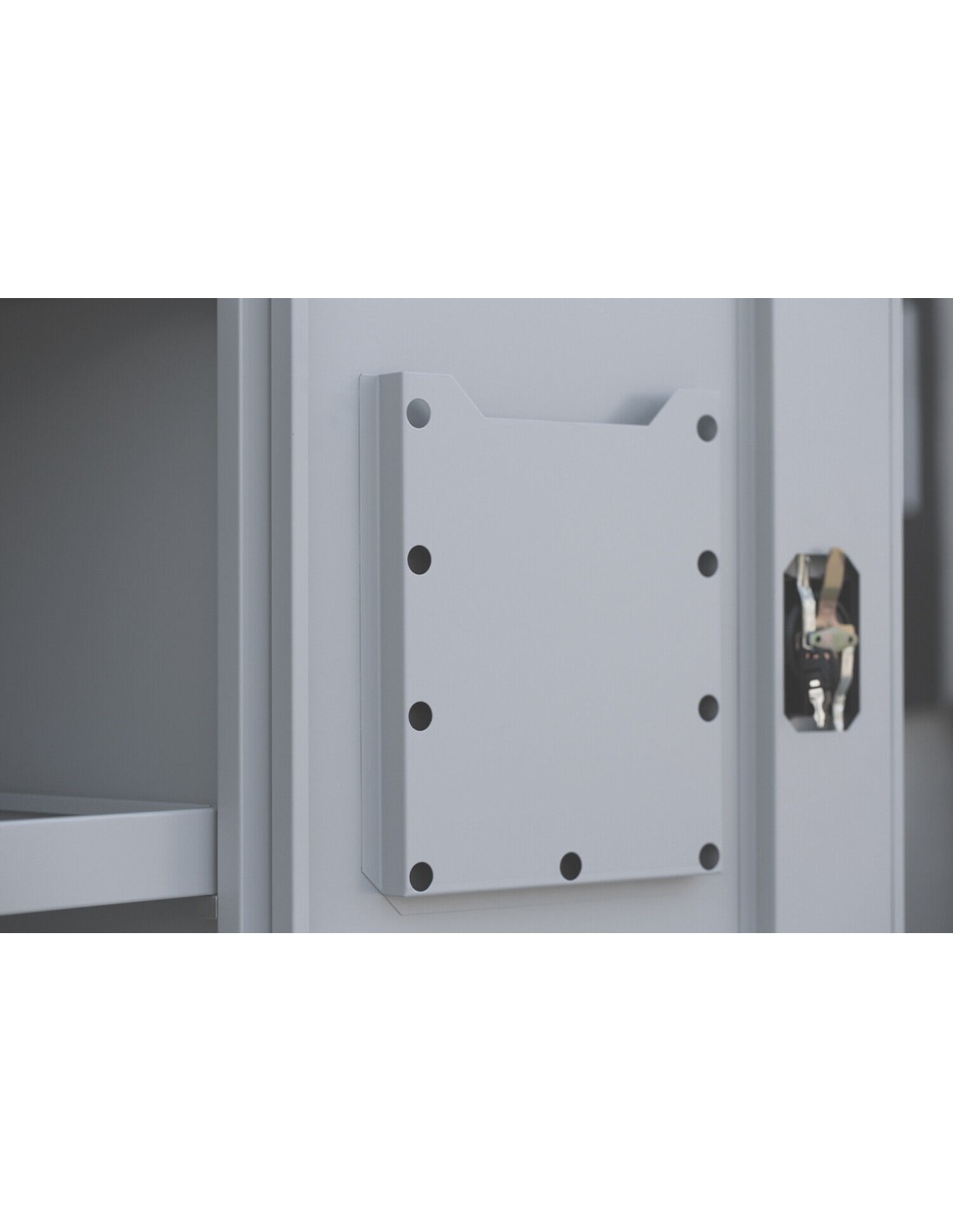 Weitere beachtenswerte Kriterien zu den Komponenten, die verwendet wurden, finden Sie hier: Das solide Material Stahl ist der Hauptbestandteil des Korpus. 0,7 mm beträgt die Wandstärke dieses Möbelteils. Machen Sie sich keine Gedanken über unschöne Schrammen oder Flecken. Die widerstandsfähige Pulverbeschichtung schützt vor bleibenden Schäden z.B. nach Stössen. Sie sorgt auch für eine leichte Reinigung. Um vor unerlaubten Zugriff zu schützen, ist Modell abschliessbar. Die Verriegelung erfolgt hier dank des stabilen Zylinderschloss mit 2-Punkt-Schliessung.