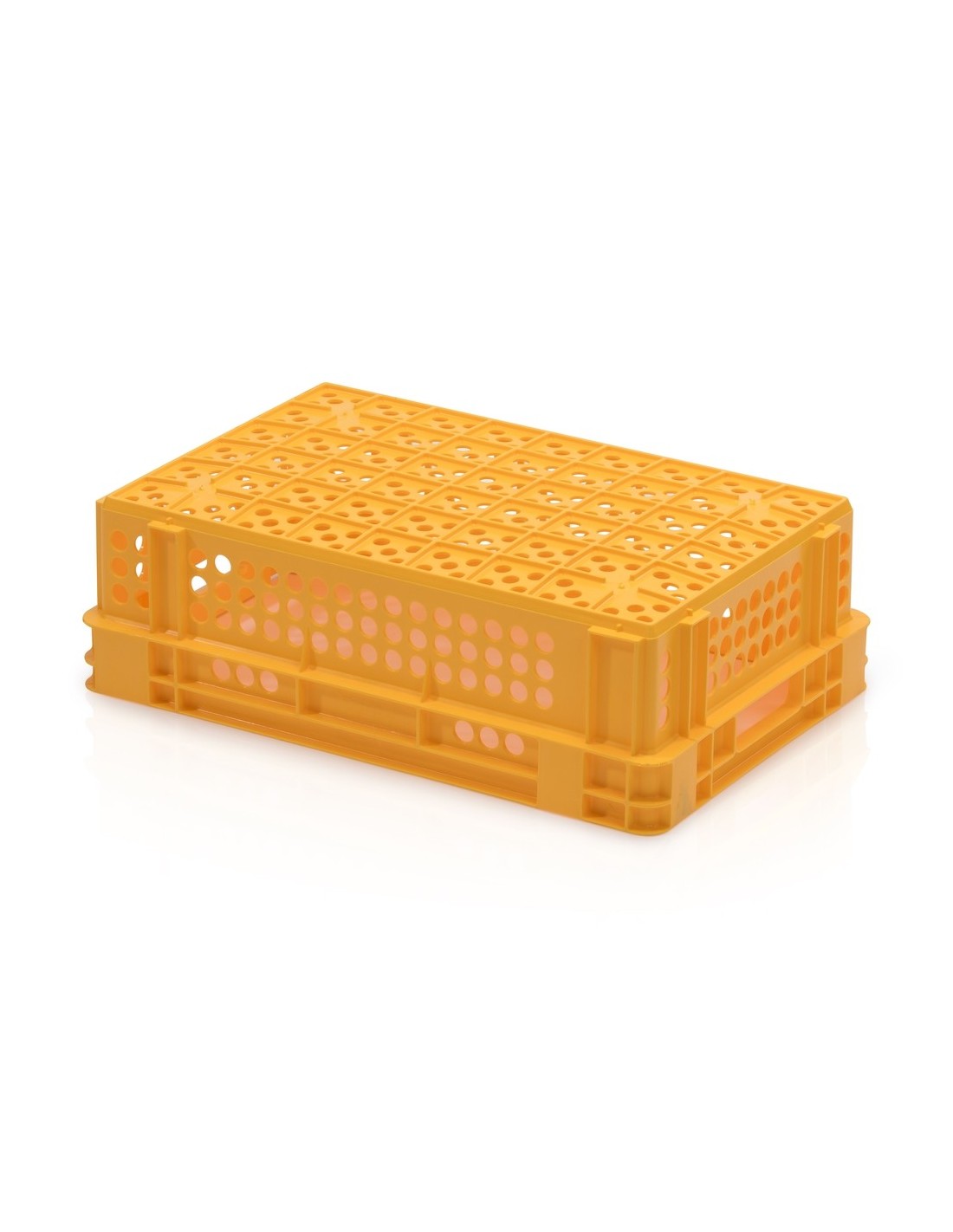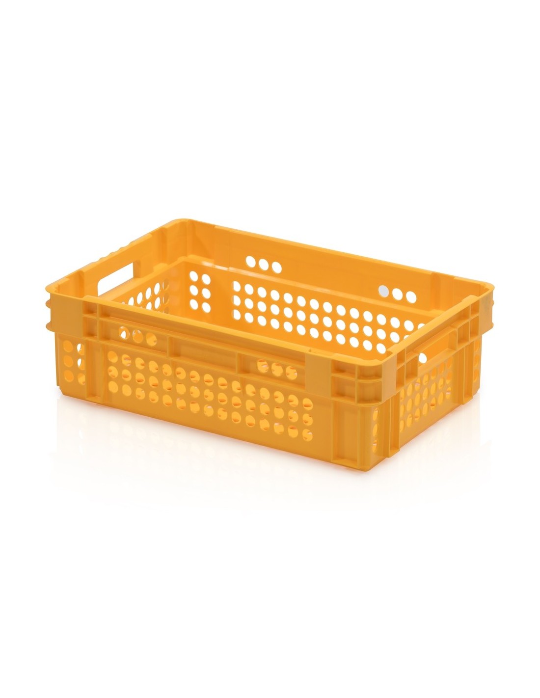 Die Bäckereikisten bestehen aus hochwertigem Polyethylen mit hoher Widerstandsfähigkeit gegen mechanische Beschädigungen und niedrige Temperaturen, was ihre Verwendung in Kühlräumen ermöglicht. Die glatten Innenflächen erleichtern die Reinigung und tragen zur Einhaltung von Hygienestandards bei.