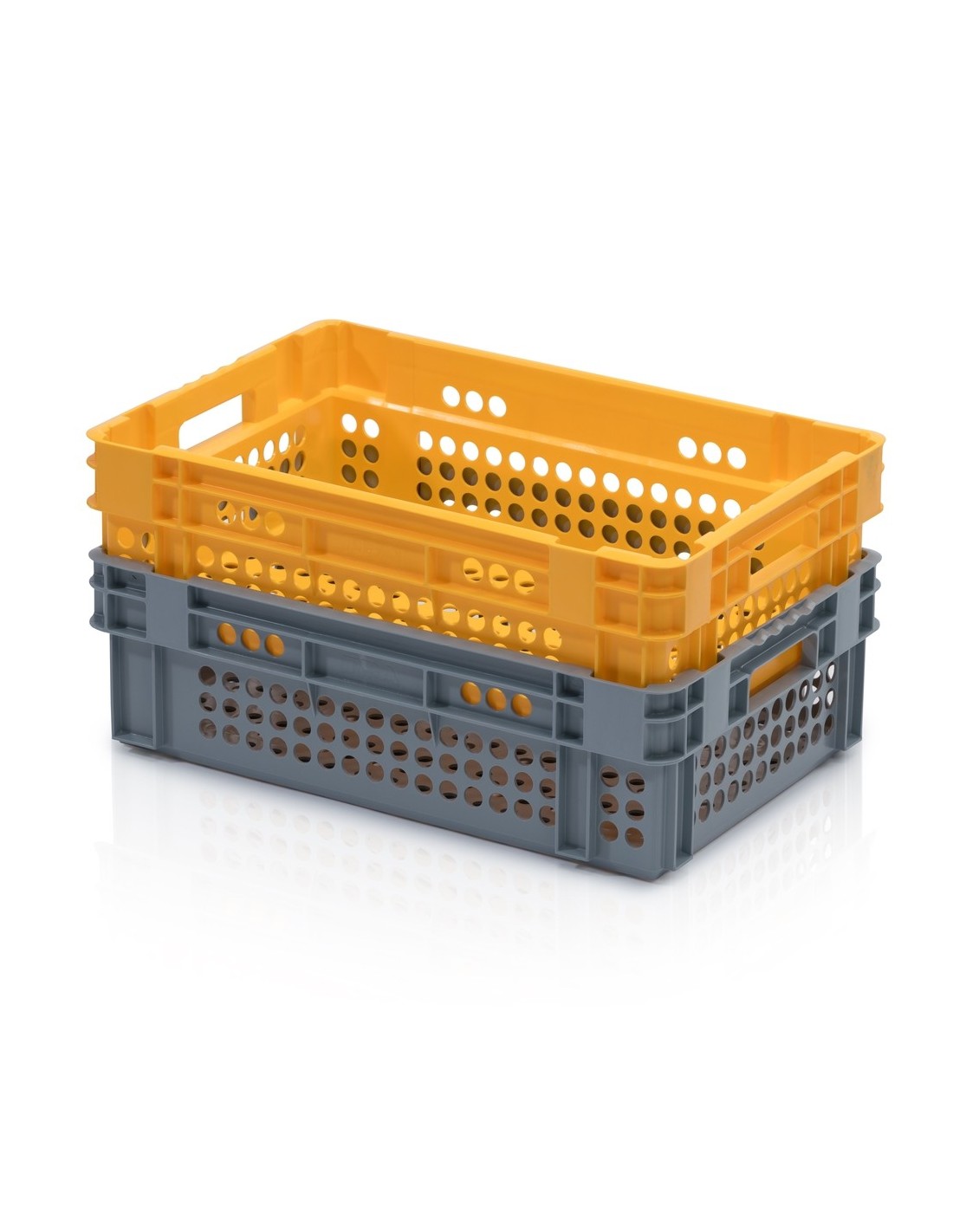 Ein grosser Vorteil dieser Kisten ist ihre Stapelbarkeit, wodurch volle Kisten sicher gestapelt werden können. Leer können sie dank eines cleveren Drehsystems platzsparend ineinander gestapelt werden, was besonders bei der Rückwärtslogistik von Vorteil ist.