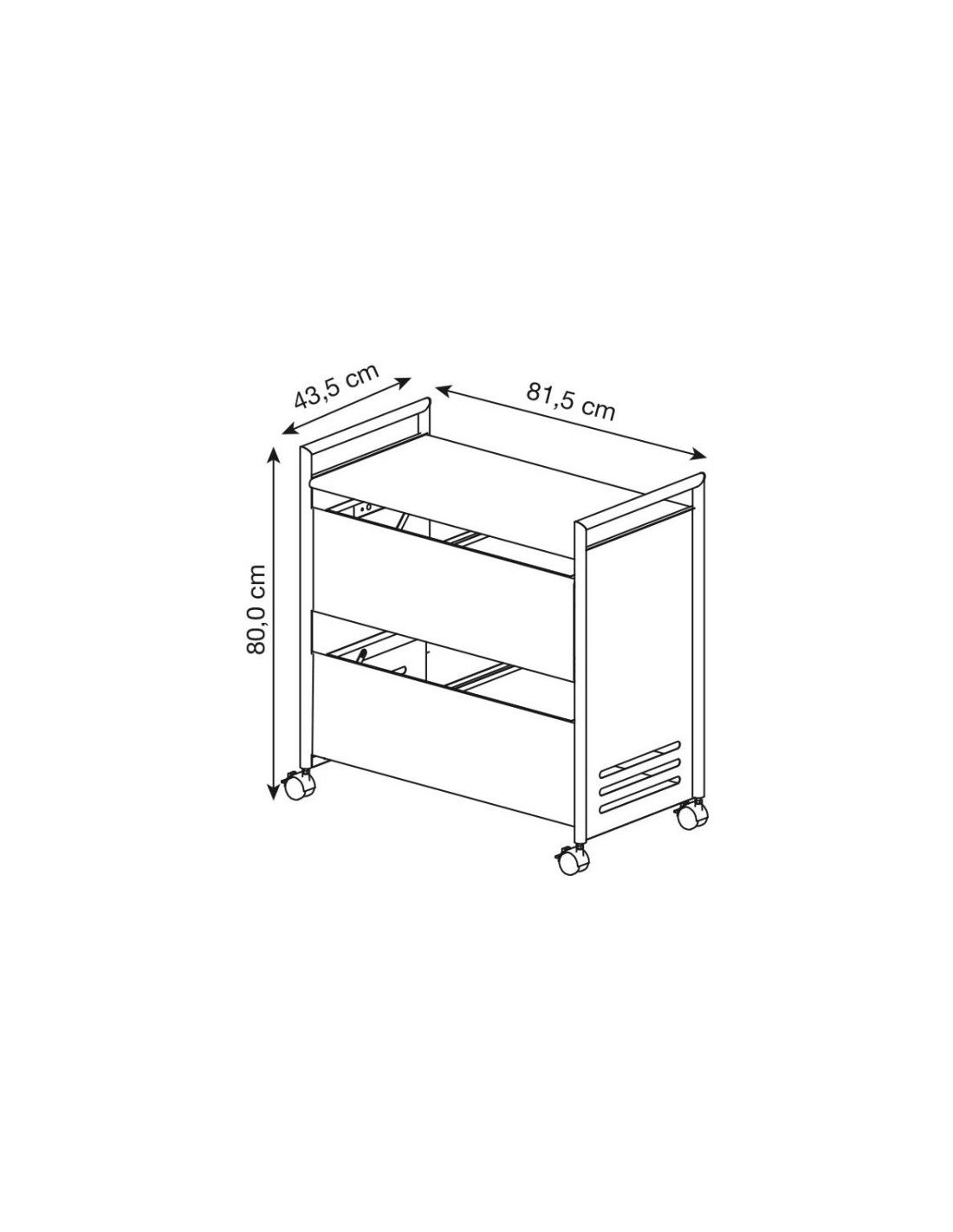 Das Gestell des Hängemappenwagens ist aus robustem Stahl gefertigt und mit einer alusilbernen Pulverbeschichtung versehen. Die Ablagefläche besteht aus melaminharzbeschichteter Spanplatte in grauer Farbe. Mit den Massen von 81,5 cm (Breite) x 80 cm (Höhe) x 43,5 cm (Tiefe) passt der Hängewagen problemlos in jedes Büro.