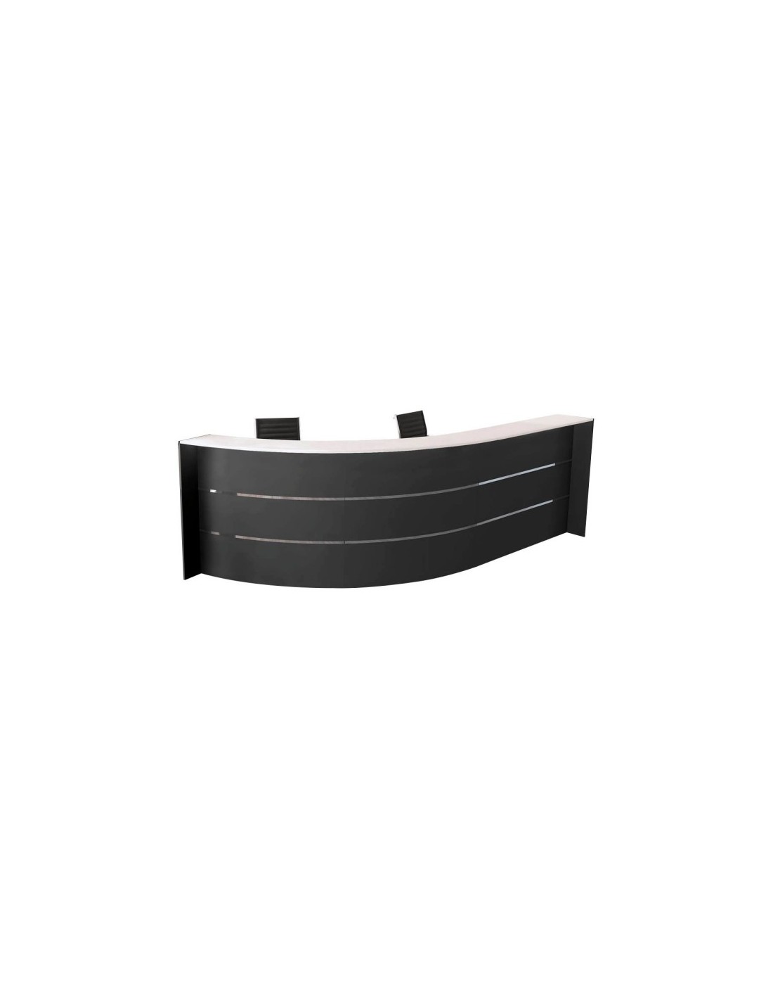 Die Empfangstheke zeichnet sich durch ihre gebogene Ausführung aus, die nicht nur optisch ansprechend ist, sondern auch den Raum optimal nutzt. Mit einer Breite von 334 cm, einer Höhe von 112 cm und einer Tiefe von 182,5 cm bietet die Theke ausreichend Platz für Ihre Mitarbeiter, um den Empfang professionell zu gestalten.