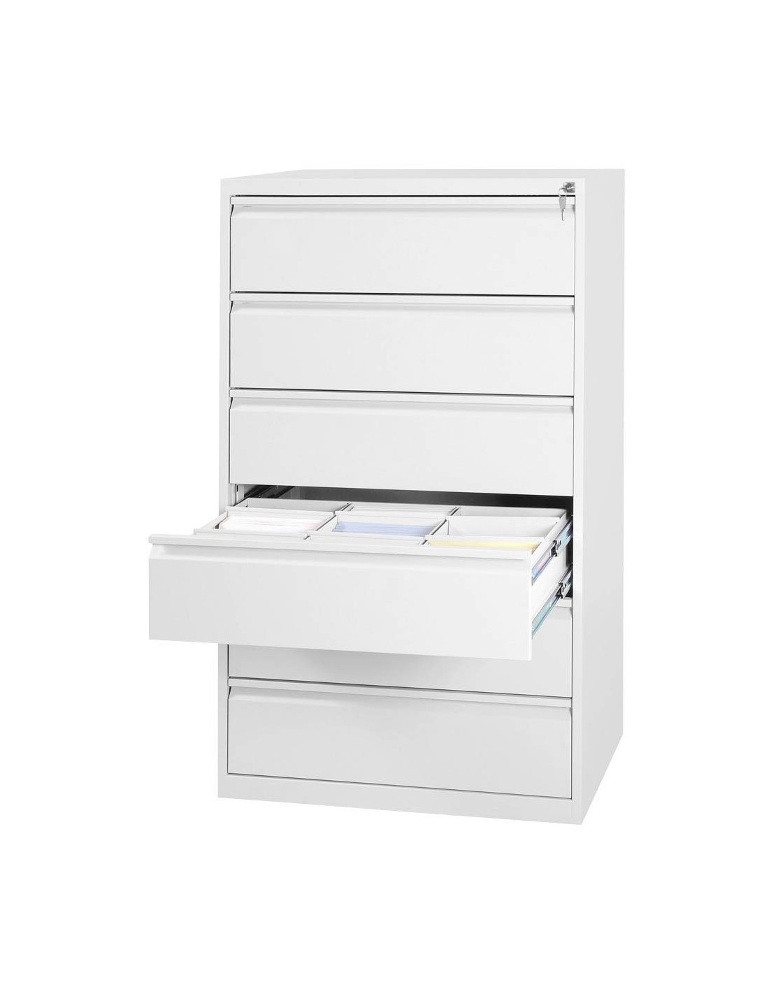 In den 6 Schüben haben Sie genügend Platz für Ihre Ihre Dokumente. Die Tragkraft je Schub beträgt bis zu 60,0 kg. Zu Ihrer Sicherheit verfügen die Schübe über eine Auszugssperre. Diese verhindert die Kippgefahr aufgrund des Eigengewichts der Schübe. Auch das gleichzeitige Öffnen von zwei Schubladen ist deshalb nicht möglich. Die einzelnen Schubladen laufen auf leichtgängigen kugelgelagerten Teleskopschienen – für ein müheloses Öffnen und Schliessen. Die einzelnen Schubladen können Sie bequem bis zu 100% aufziehen. Die Schubladen für Ihre Dokumente und Ablage sind dreibahnig ausgestattet. Praktische Trennschienen beugen einem Verrutschen der Karteien vor, was eine ordentliche Ablage gewährleistet.
