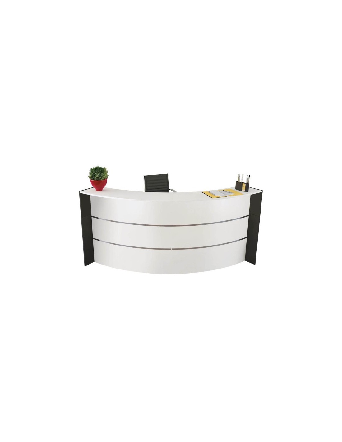 Die Theke verfügt über eine Arbeits- und Ablagefläche mit einer Breite von 255 cm und einer Höhe von 112 cm, was sie ideal für Empfangsbereiche macht. Die zwei Rund-Thekenelemente sind im 39,5 Grad-Winkel angeordnet, was eine einladende Atmosphäre schafft. Zudem sorgen zwei Kabeldurchlässe für eine komfortable Kabelführung durch die Tischplatte.