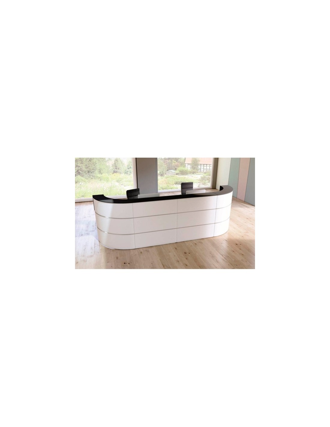 - Besonderheiten: Der Thekenkörper aus Metall ist mit dekorativen 20 mm hohen Edelstahlstreifen versehen. Tischplatte serienmässig mit Kabeldurchlassdose