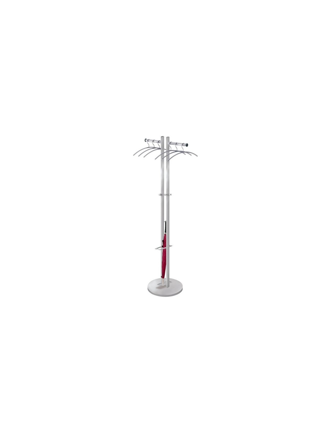 Elegant, stabil und praktisch - zu einem Preis der sich sehen lassen kann. Die 6 Metallkleiderbügel, die 6 Haken und der integrierte Schirmständer machen diesen Garderobenständer zu einem zuverlässigen Helfer. Extrem standsicher durch die stabile Stahlsäule und den gewichtgefüllten Fuss. Gesamthöhe: 167,0 cm. Ø Fussteller: 39,0 cm. Gewicht : ca. 12,0 kg. Farbe : alusilber.