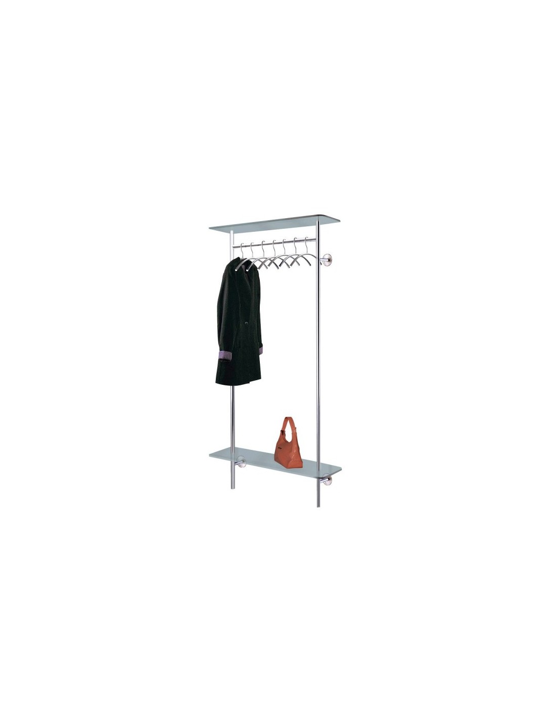 Platzsparend und edel ist diese doppelsäulige Wandgarderobe mit Kleiderbügelstange. Auf ihrer Ablage aus Sicherheitsglas finden Taschen bequem Platz. Die massive Wandbefestigung sorgt für guten Halt und die 8 verchromten Kleiderbügel nehmen Jacken und Mäntel mühelos auf.