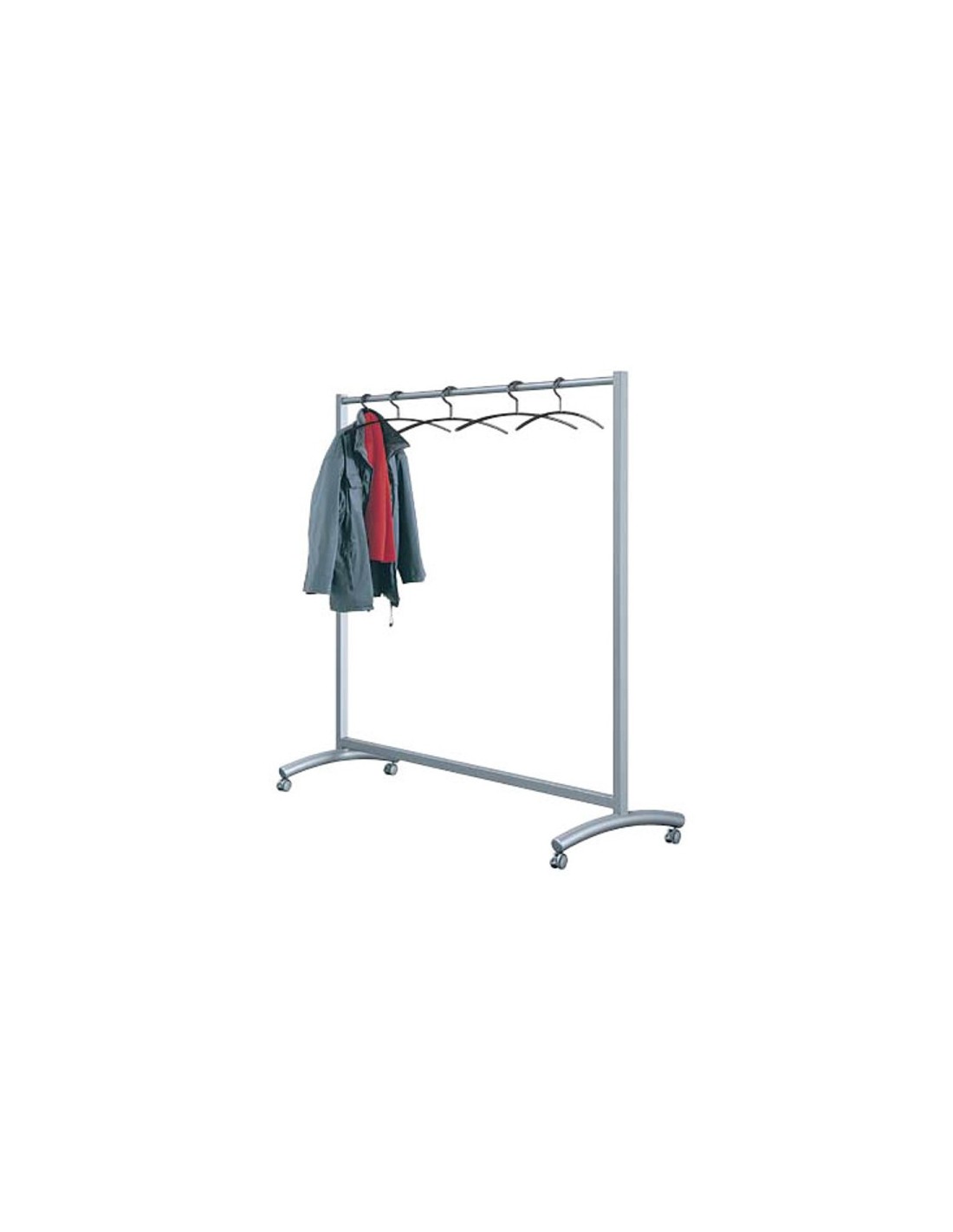 Sehr stabile Ausführung aus pulverbeschichtetem Stahlrohr. Bügelrohr mit 30 mm Durchmesser. Mobil durch 4 Doppellenkrollen mit Radfeststellern. Grösse: 1.780 x 530 x 1.710 mm (B x T x H). Farbe: alusilber.