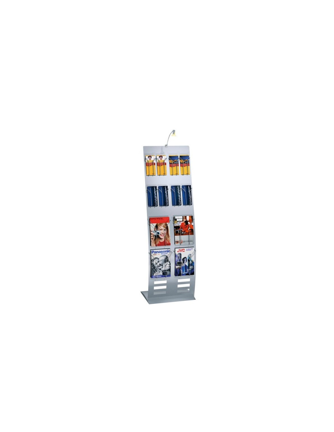 Aus gelochtem Stahl, pulverbeschichtet. In den Ständer können bis zu 8 Prospektfächer für DIN A4 oder bis zu 16 Prospektfächer für DIN-lang eingehängt und kombiniert werden. Grösse: 520 x 460 x 1.650 mm (B x T x H), Farbe: alusilber. Lieferung ohne Prospektfächer und Infoschild, Artikel wird zerlegt angeliefert. Das Prospektfach für DIN A4 ist mit Bestellnr. 2552626 und das Prospektfach für DIN-lang ist mit Bestellnr. 2552625 bestellbar. Als Zubehör kann noch ein Infoschild Bestellnr. 2552621 und eine Leuchte Bestellnr. 2552622 bestellt werden.