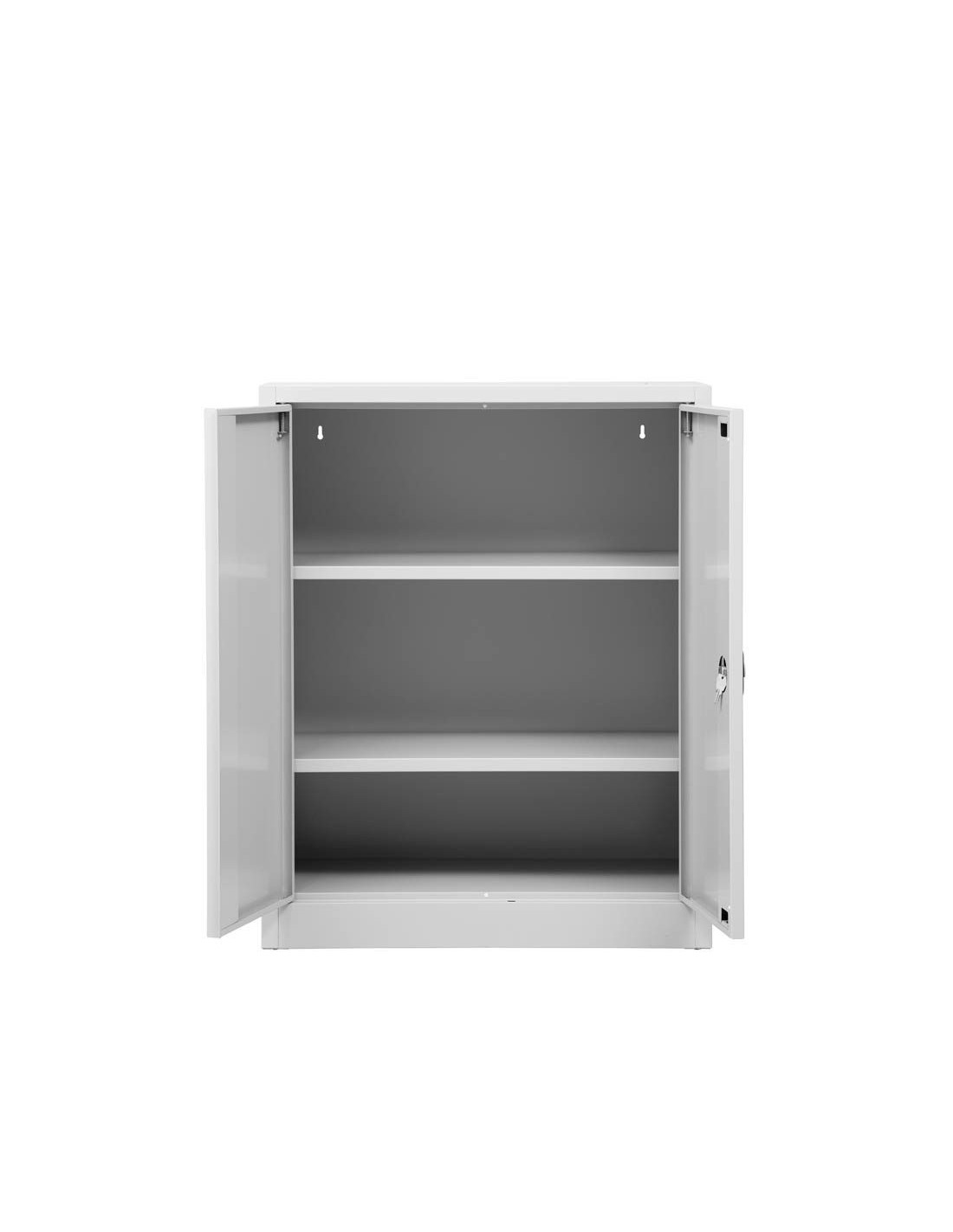 Die erstklassigen Materialien und deren Herstellungsart zeichnen dieses Möbelstück aus. Das Material Stahl, aus dem der Korpus besteht, ist robust. Die Wandstärke des Korpus beträgt 0,7 mm. Dank der Pulverbeschichtung ist die Oberfläche unempfindlich bei Stössen und lässt sich kinderleicht reinigen. Das Modell ist mit einem abschliessbaren Schloss versehen – ideal, damit nicht jeder Zugriff hat. Das eingebaute Zylinderschloss mit 2-Punkt-Schliessung ist hierfür zuständig.