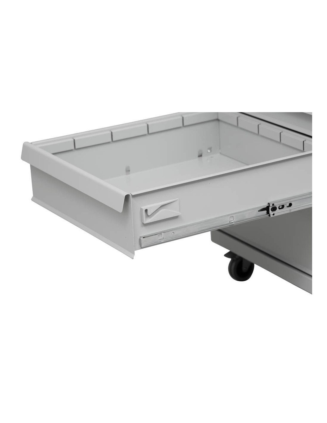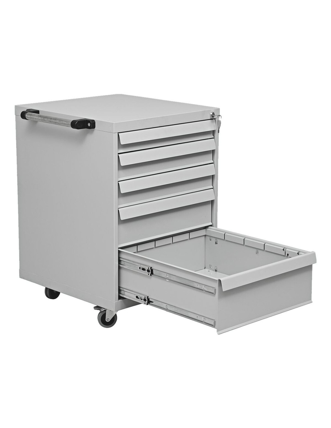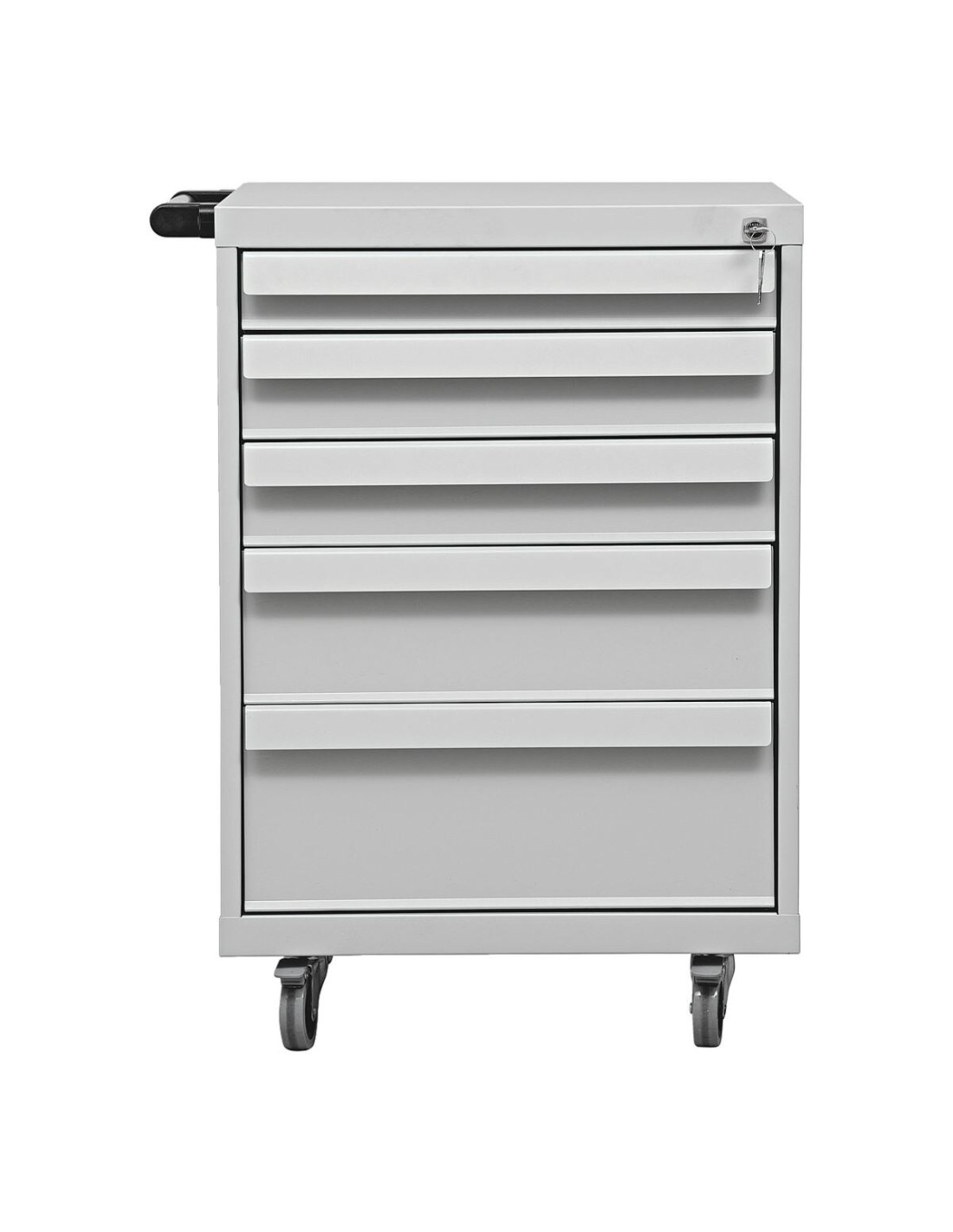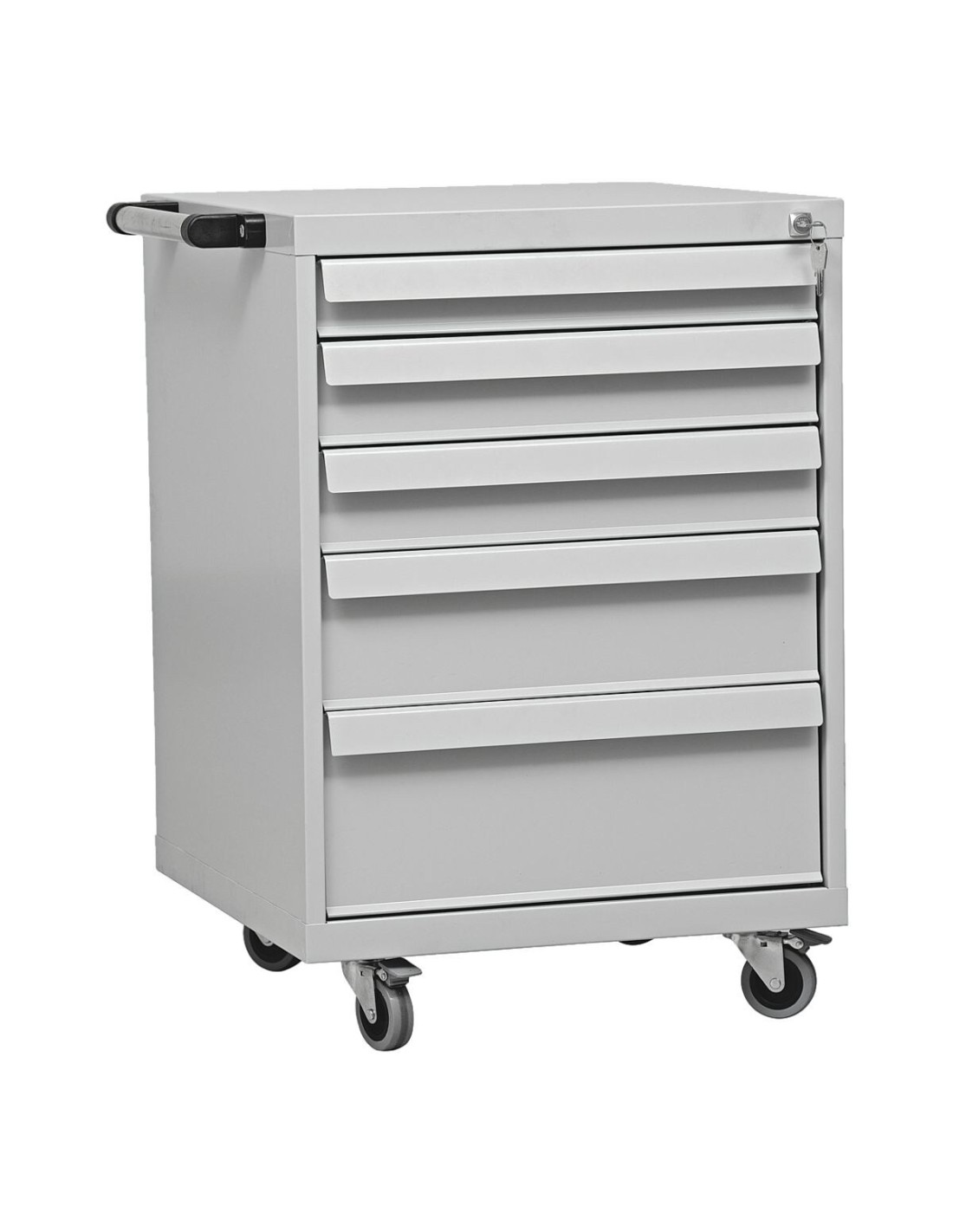 Werkstatt-Trolly, Ausführung: mit 5 Schubladen, Zentralverschluss, 2 Schlüssel, Material: pulverbeschichteter Stahl, 4 Rollen (2 feststellbar), mit Griff an der Seite, Gewicht: 58,2 kg