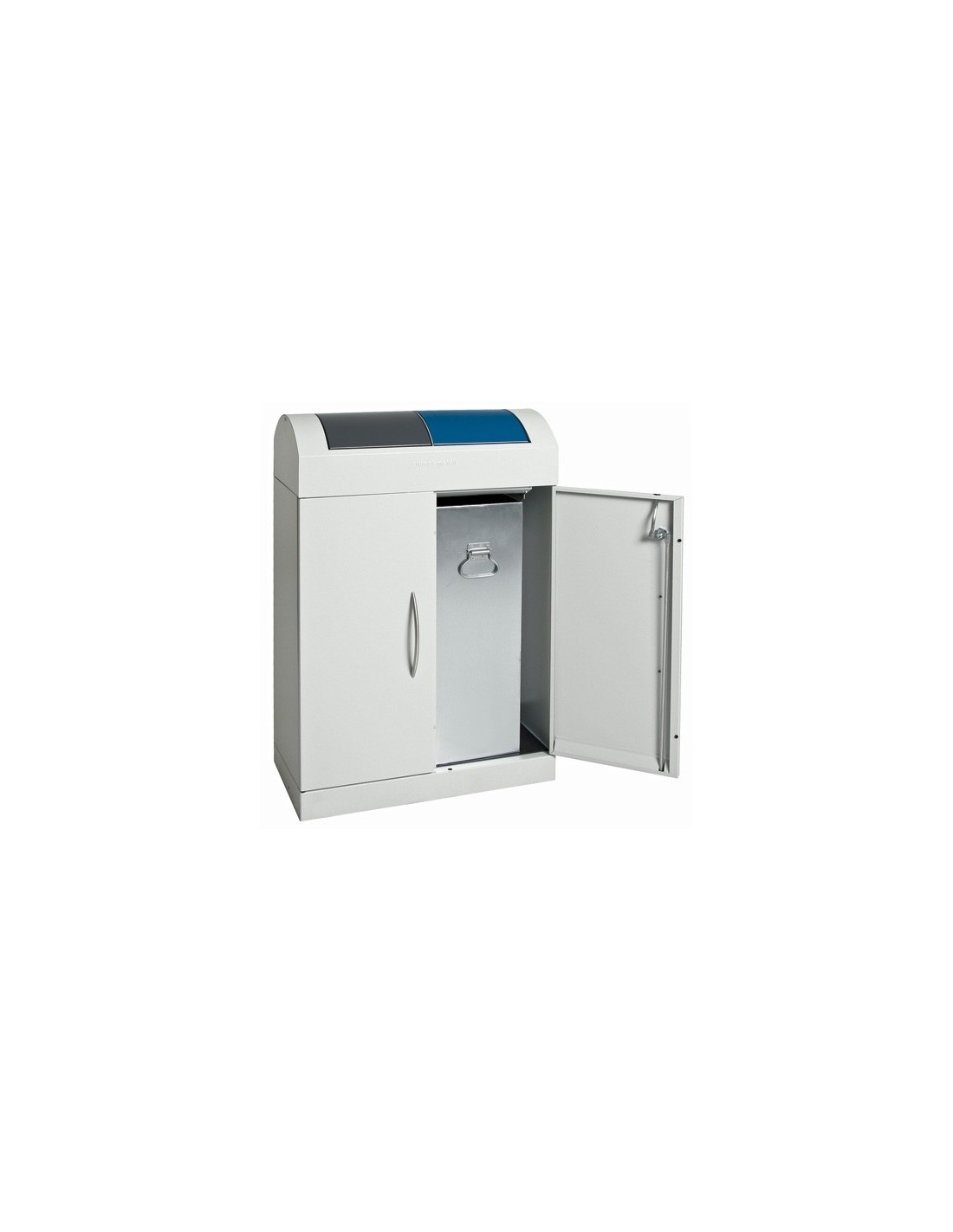Die frontseitig eingelassene Flügeltüre mit Vierkantschloss ermöglicht ein einfaches Entnehmen der Abfalltüten. Die selbstschliessenden Pendelklappen sorgen für eine feuer- und geruchshemmende Wirkung. Zwei ergonomische Edelstahlgriffe an den Flügeltüren erleichtern die Handhabung.