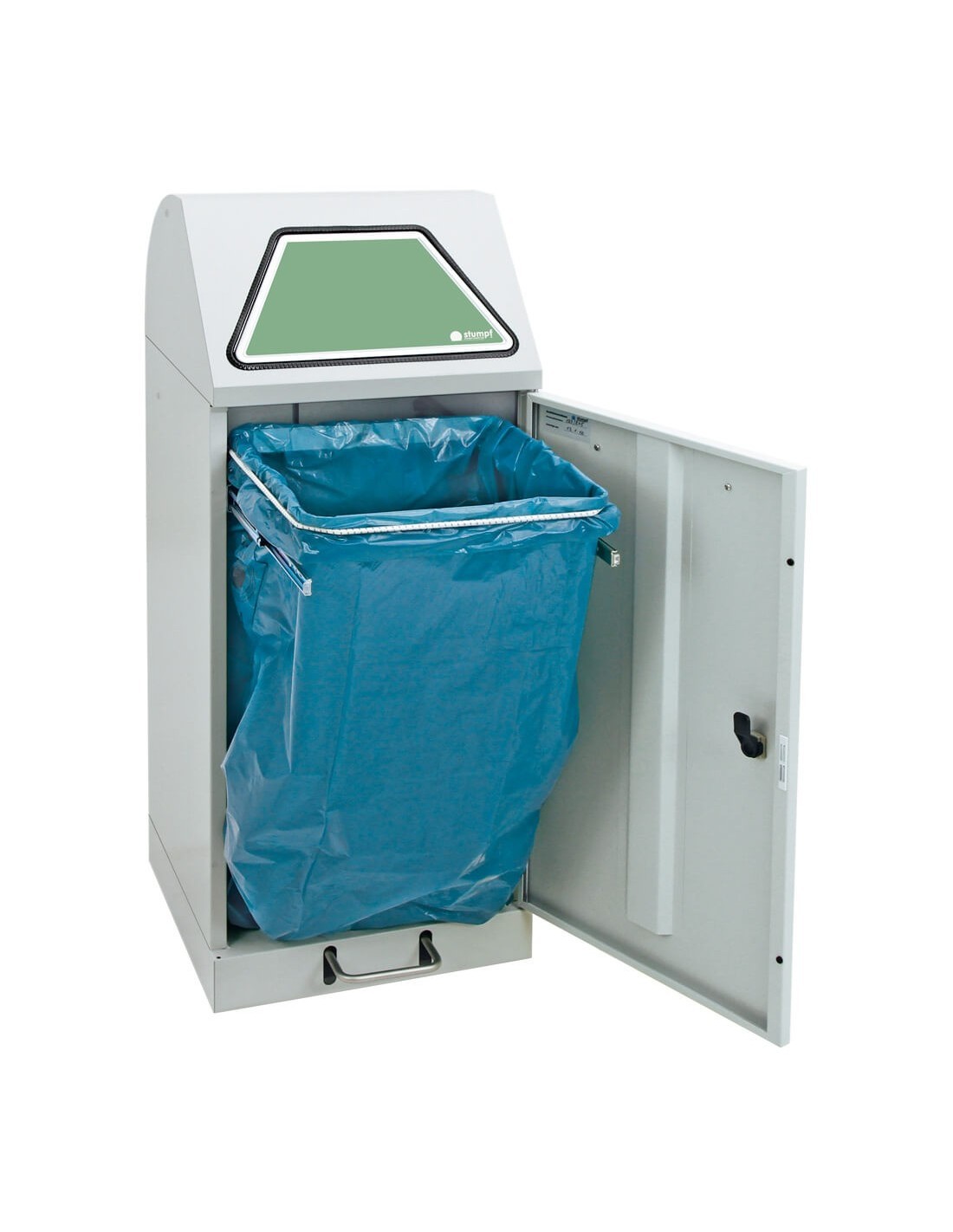 Dieser Abfalltrenner von Stumpf ist aus hochwertigem Stahlblech gefertigt und verfügt über ein Fassungsvermögen von 75 Litern. Das ProSlide-System ermöglicht einen schnellen und einfachen Wechsel von Abfalltüten, während die Einwurfklappe mit Trethebel und Dämpfer geräuschlos schliesst.