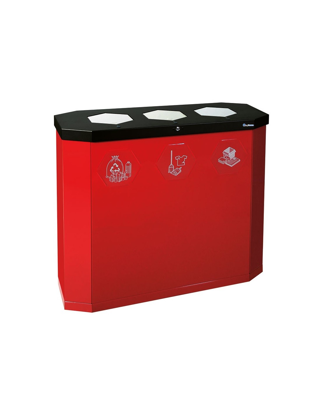 Das System verfügt über sechseckige Einwurfklappen aus Edelstahl und ein Piktogramm-Set für die Abfallarten Restmüll, Papier, Kunststoffe, Bio-Abfall und Glas. Der Korpus ist rubinrot (RAL 3003) und das Kopfelement tiefschwarz (RAL 9005 struktur) lackiert. Die Sixco-3fach-Recycle-Station wird in Deutschland in einer vom TÜV zertifizierten Fertigungsstätte hergestellt.
