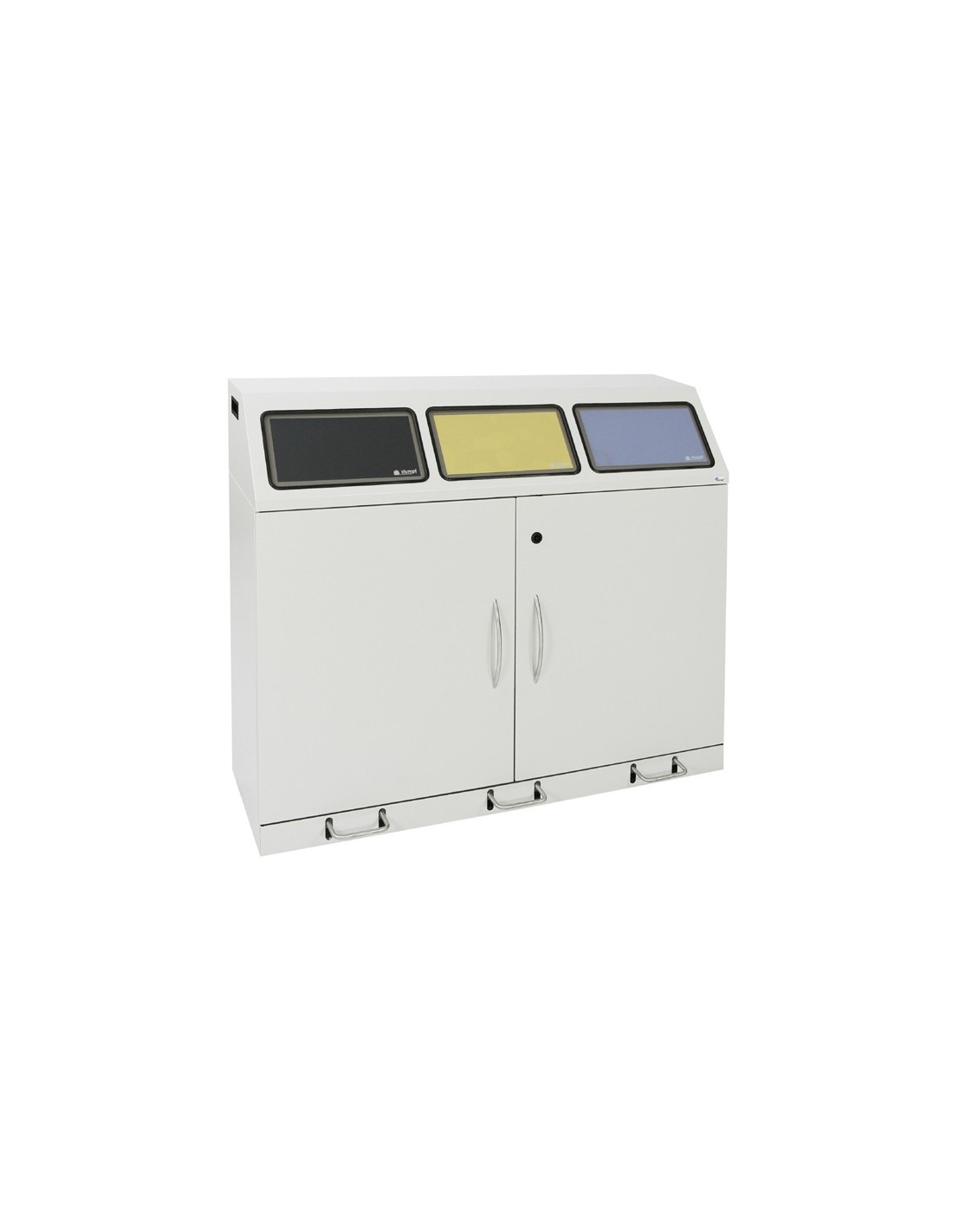 Diese Abfalltrennstation bietet eine praktische Lösung zur getrennten Entsorgung von Papier/Pappe, Gelber-Sack-Abfällen und Restmüll. Die Einwurfklappen lassen sich einfach und hygienisch per Fusshebel betätigen und sind jeweils farblich gekennzeichnet. Mit den mitgelieferten Schutzfolien können die Einwurfklappen zusätzlich markiert werden. Im Inneren der Station befinden sich 3 verzinkte Behälter mit einem Fassungsvermögen von jeweils 70 Litern.