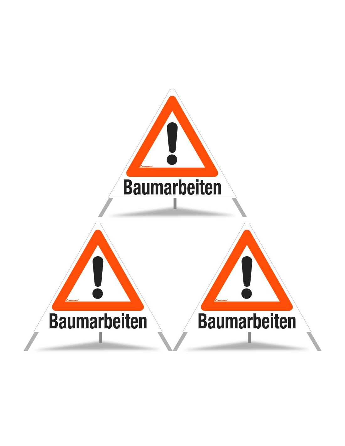 Dank der klaren Beschriftung "Baumarbeiten" ist dieses Faltsignal speziell für den Einsatz bei Baumarbeiten im Strassenverkehr konzipiert. Die Positionierung der Beschriftung aussen unterhalb des Dreiecks sorgt für optimale Sichtbarkeit.