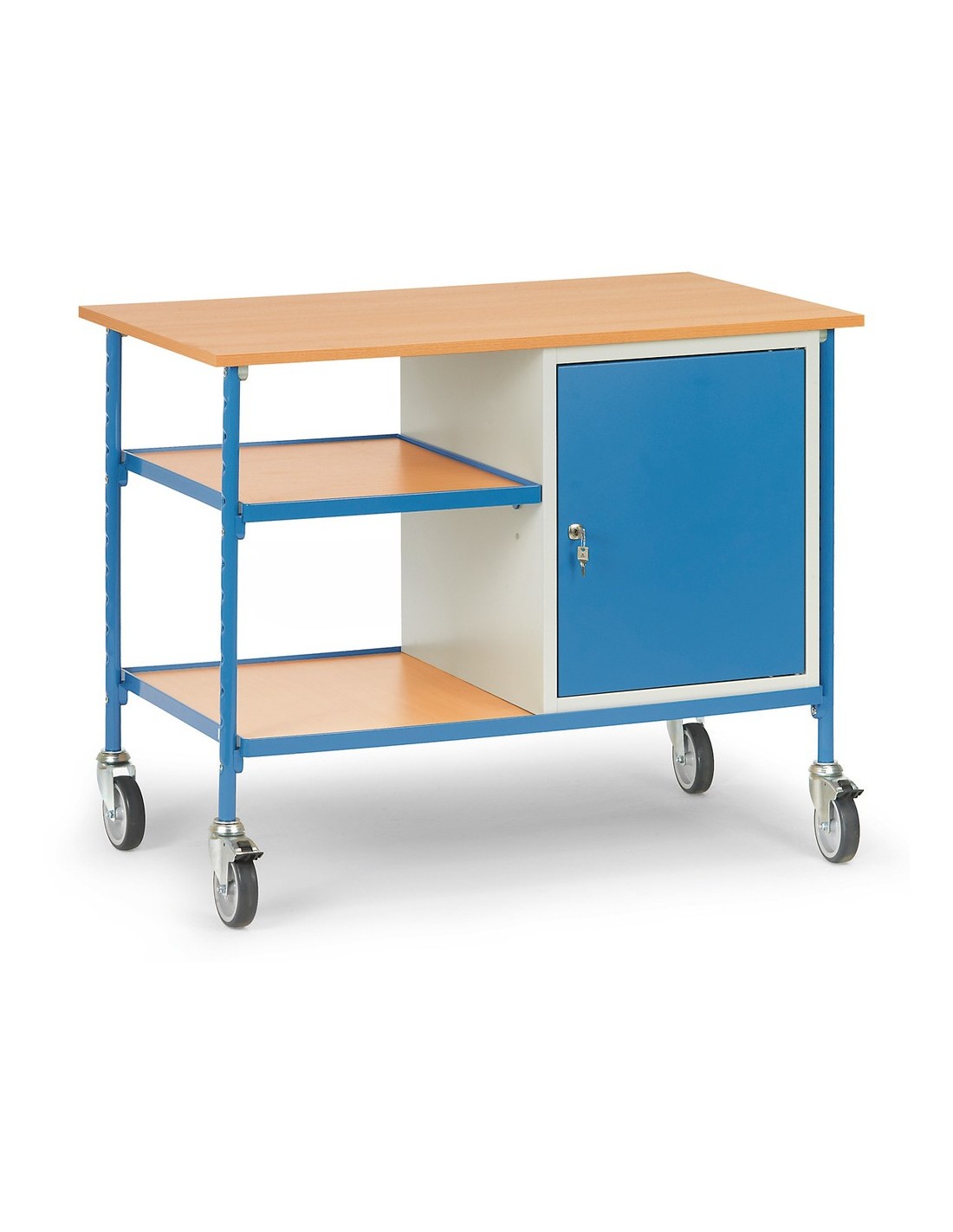 Cette table roulante à 3 niveaux avec armoire en acier est idéale pour une utilisation dans les entrepôts, les ateliers et autres environnements industriels. Grâce à sa surface revêtue de poudre de couleur bleue RAL 5007, elle est non seulement robuste, mais aussi esthétiquement attrayante.