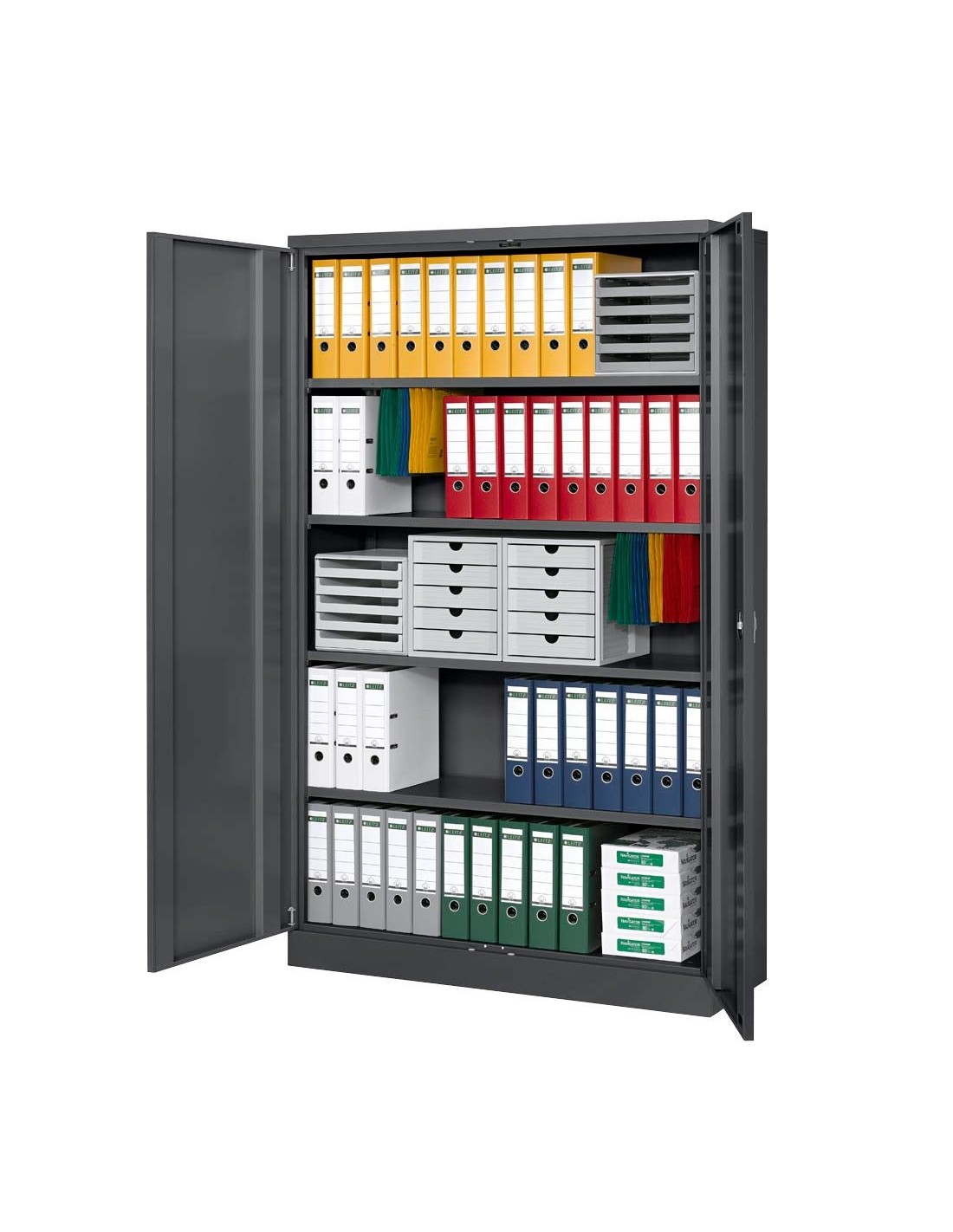 Grâce aux étagères intégrées, le contenu de l'armoire est bien rangé et visible d'un coup d'œil. Avec ce meuble, vous disposez de 4 étagères bien équipées. La capacité de charge élevée de ces étagères est de 60,0 kg chacune. Vous souhaitez savoir combien de rangées de classeurs vous pouvez y mettre ? Vous avez de la place pour 5 rangées de classeurs.
