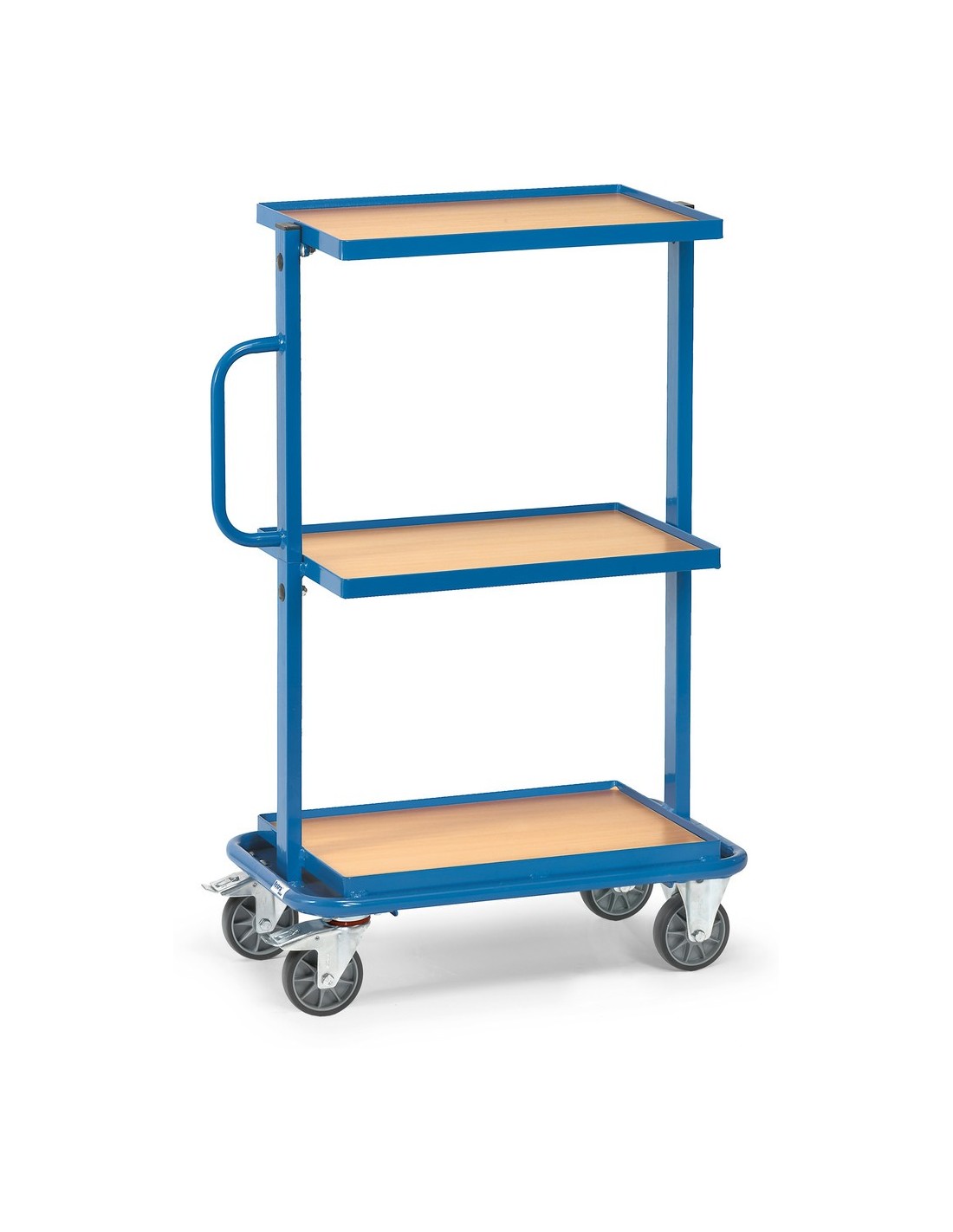 Questo carrello aggiuntivo di Fetra è dotato di 3 piani in legno e ha una superficie di carico di 605 x 405 mm. La struttura in tubo d'acciaio e profilato d'acciaio è verniciata a polvere in blu RAL 5007 e garantisce stabilità e durata nel tempo.