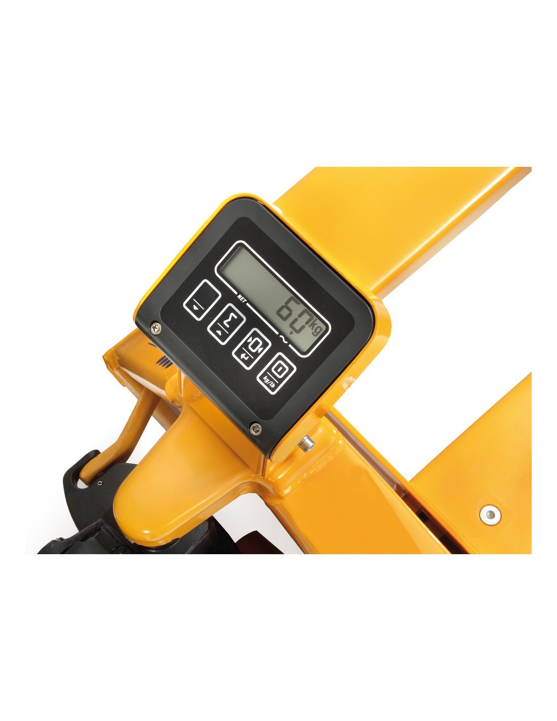 Questo transpallet con bilancia integrata è ideale per il trasporto e la pesatura semplice di carichi. Il telaio e le forche sono realizzati in costruzione a guscio priva di torsione e verniciati a polvere gialla. La pompa idraulica manuale è montata senza necessità di manutenzione, mentre il manico in tubo d'acciaio stabile garantisce una facile manovrabilità.