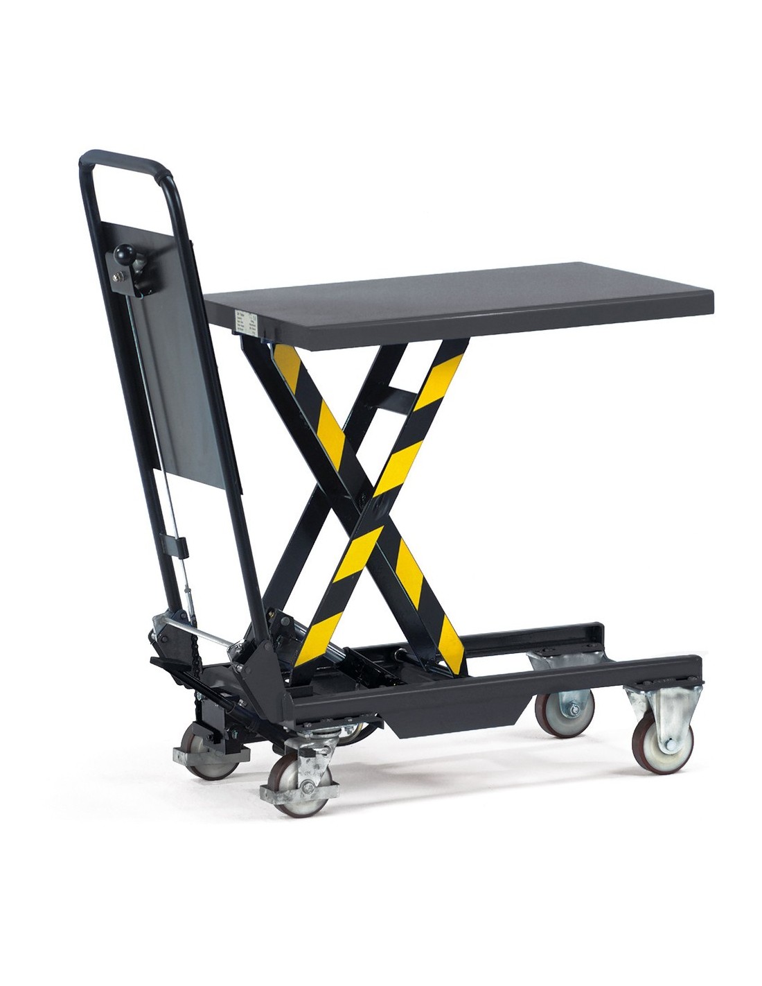Carrello elevatore realizzato in acciaio profilato/lamiera d'acciaio, verniciato a polvere antracite RAL 7016. Robusto maniglione a tubo. Pompa idraulica con pistoni cromati. Azionamento tramite pedale. Valvola di discesa sensibile azionabile tramite leva manuale. 2 ruote sterzanti e 2 fisse, ruote con rivestimento in poliuretano, ruote sterzanti con freno. Maniglione a tubo pieghevole. Piattaforma alta 50 mm.