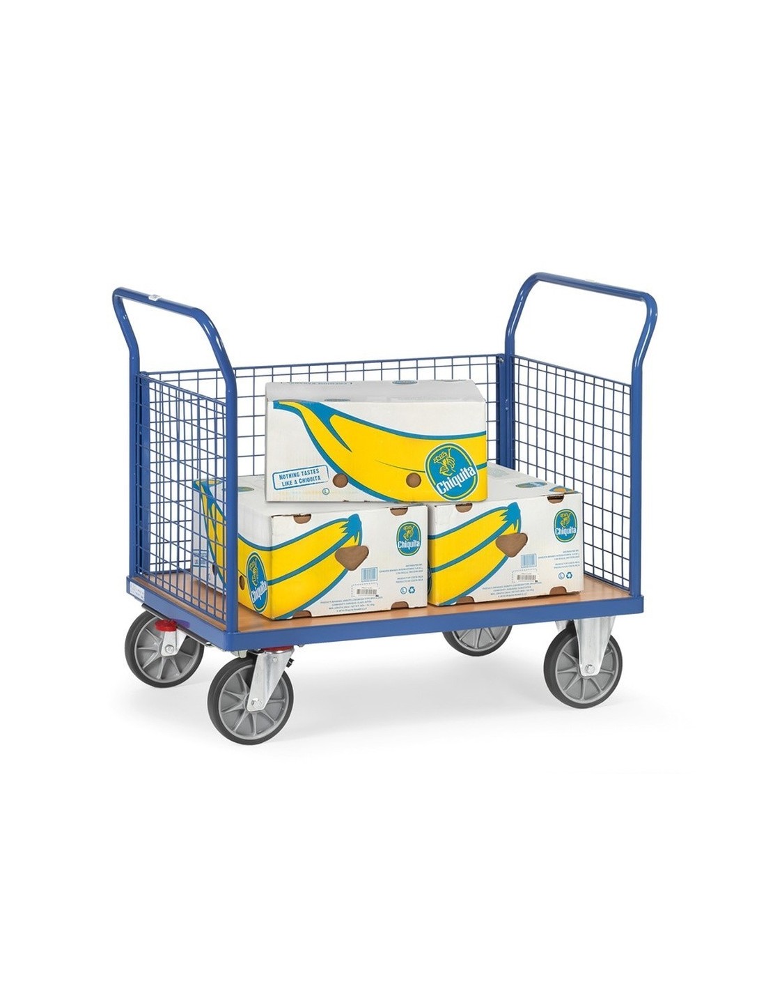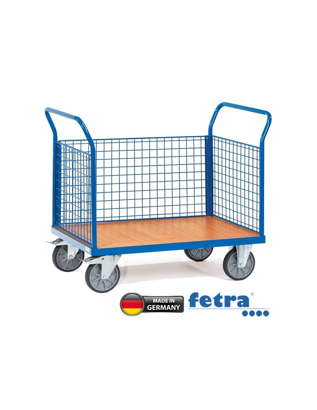 Il prodotto offerto è realizzato in tubi d'acciaio saldati e profilati d'acciaio, verniciati a polvere e di colore RAL 5007. La piattaforma del prodotto è composta da un pannello in legno con decorazione in faggio. Inoltre, sono presenti due pareti frontali e una parete laterale in rete metallica con dimensioni di 50 x 50 x 4 mm e un'altezza di 500 mm. La mobilità del prodotto è garantita da 2 ruote giratorie e 2 fisse, dotate di rivestimento in TPE e mozzi con cuscinetti a sfere scanalate. Una sicurezza aggiuntiva è garantita dal fermo sulle ruote giratorie, conforme alla norma europea EN 1757-3. In generale, si tratta di una soluzione robusta e di alta qualità che offre numerose possibilità di utilizzo sia nel settore privato che commerciale.