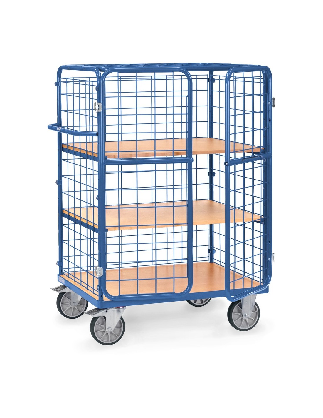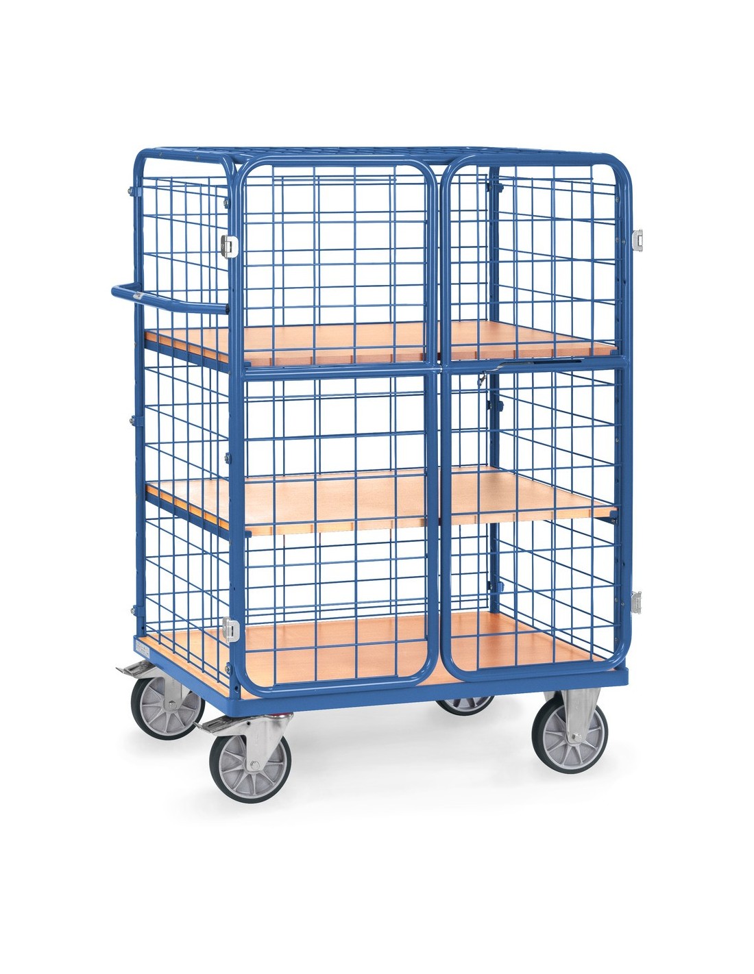 Questo carrello a più piani Fetra è ideale per il trasporto di merci su più livelli. Con 3 pareti in rete metallica, un tetto e porte ad anta, offre una protezione ottimale e sicurezza per la merce trasportata.
