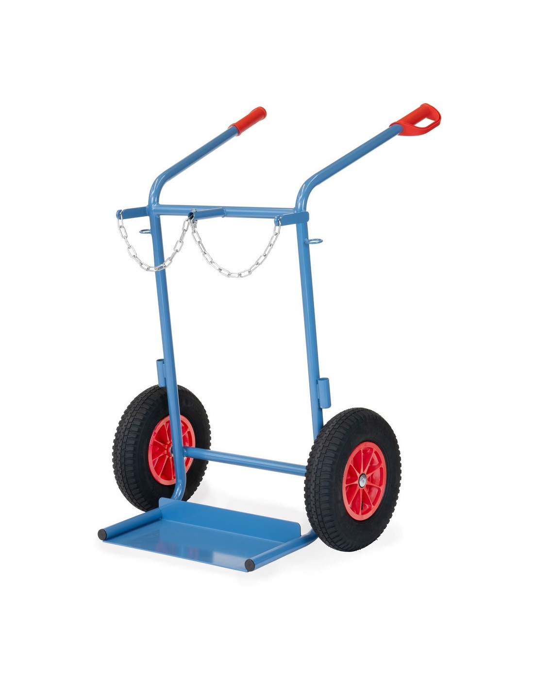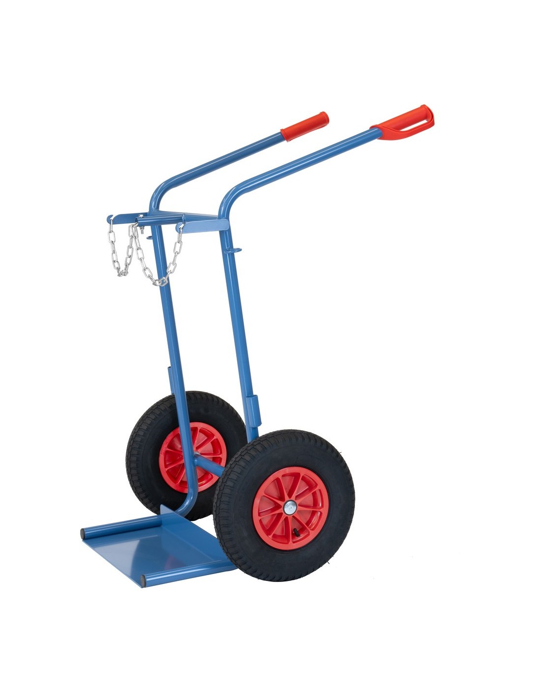 Caratteristiche tecniche: - Struttura in tubi d'acciaio saldati puliti - Pala in lamiera d'acciaio verniciata a polvere in blu RAL 5007 - Catena di sicurezza agganciabile per una presa sicura delle bombole - Bordi su tre lati della pala - Manici in plastica con protezioni per le mani - Opzione di pneumatici o gomma piena per diversi tipi di terreno - Mozzi robusti con cuscinetti resistenti - Porta filo da saldatura su entrambe le barre
